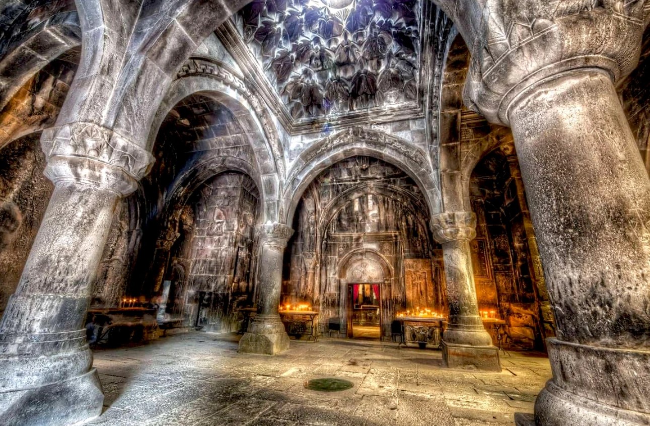 1. Монастырь Гегард — вырублен прямо в скалах Котайкского ущелья в XII–XIII веках. Монахи создали целые залы внутри горы, и когда луч света пробивается сквозь узкую щель в каменном потолке — это выглядит как намеренно срежиссированная сцена, поставленная на века. Название «Гегард» означает «Копье» — по преданию, именно здесь хранилось копье, которым пронзили тело Христа. Объект Всемирного наследия ЮНЕСКО. Вход — бесплатный.